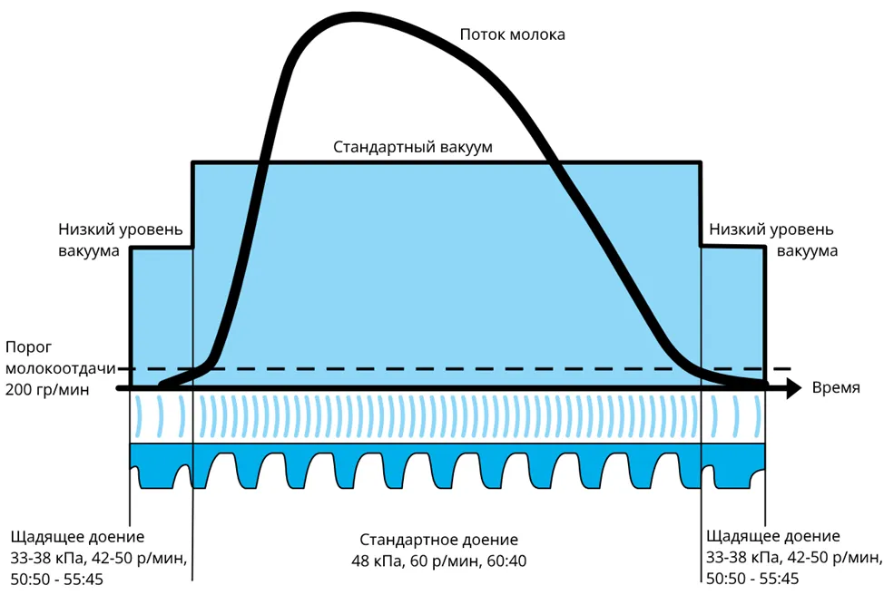 В начале доения, пока поток молока не достиг значения 200 гр/мин, осуществляется щадящее доение: вакуум 33-38 кПа частота пульсации 42-50 раз в минуту при соотношении тактов 50:50-55:45. После того как скорость молокоотдачи превысит значение 200 гр/мин осуществляется доение со стандартными параметрами: вакуум 48 кПа частота пульсации 60 раз в минуту с соотношением тактов 60:40. В конце доения, когда скорость молокоотдачи снижается до значения 200 гр/мин, доение осуществляется в щадящем режиме (вакуум 33-35 кПа частота пульсации 42-50 р/мин. при соотношении тактов 50:50).