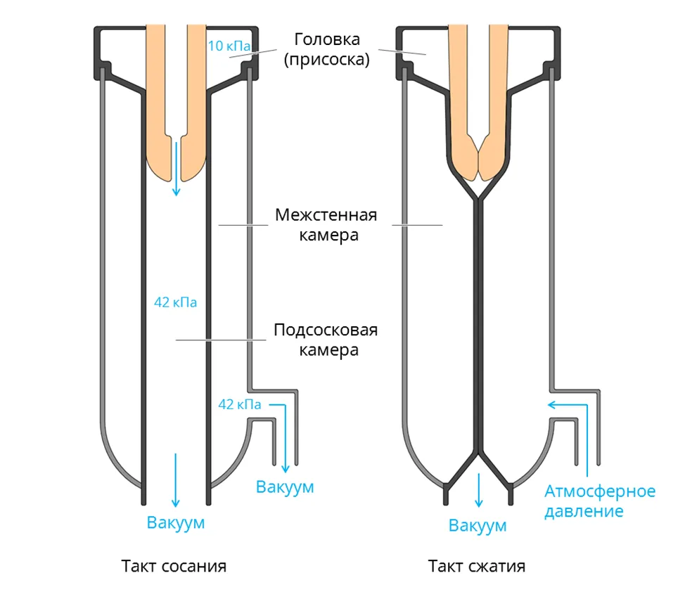 Молоко извлекается с помощью вакуума в такте сосания. Под действием вакуума сфинктер соска раскрывается.