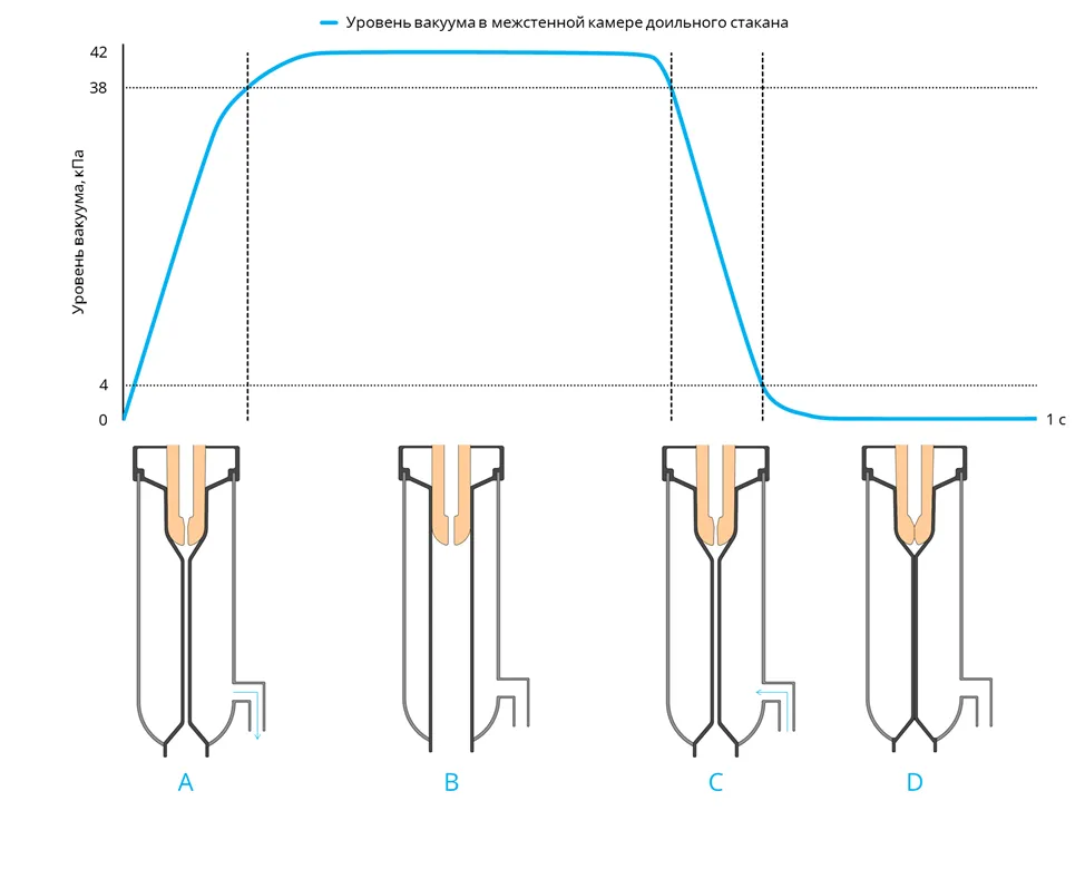 Таким образом, слишком кратковременная фаза А вызывает эффект обратного впрыска в результате избыточного давления, а слишком длительная фаза А уменьшает эффективность фазы В и снижает скорость доения.