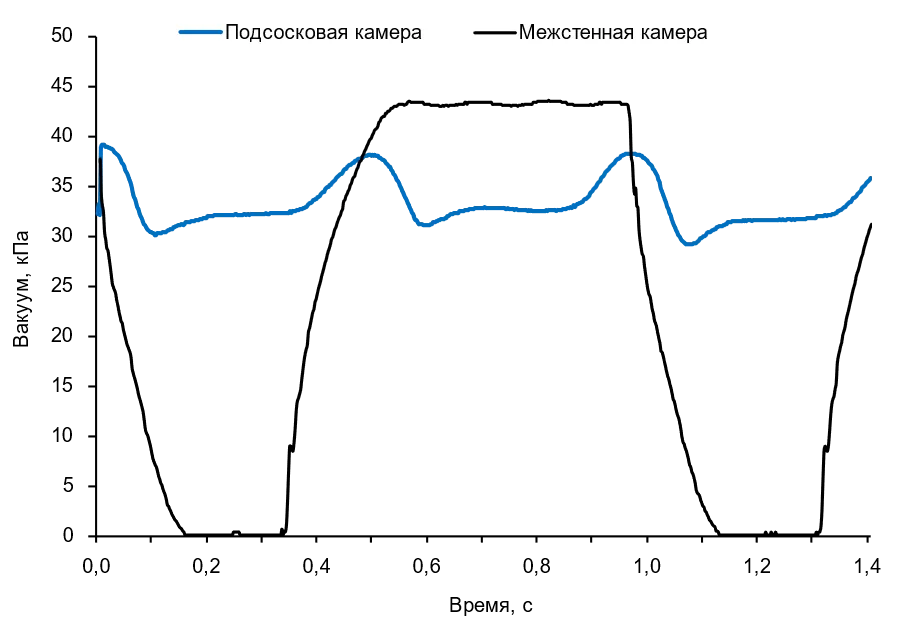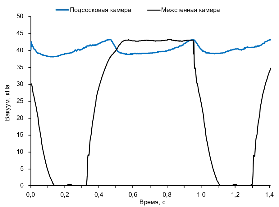 Уровень вакуума в камерах доильного стакана в процессе доения при стабильном вакуумном режиме доильного аппарата