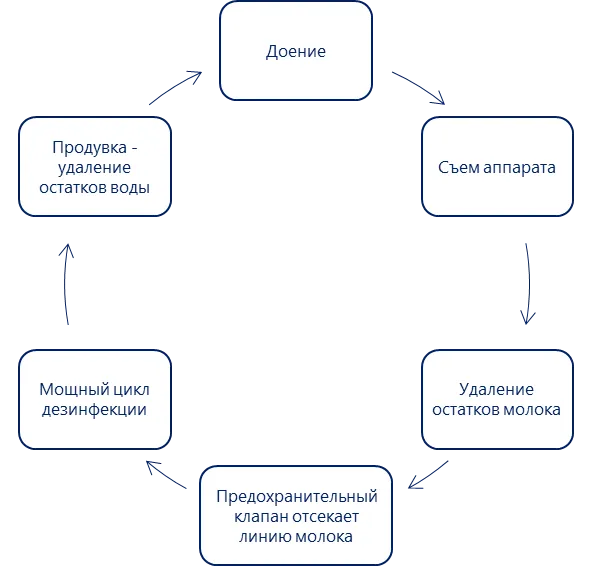 5. Заключительная продувка сжатым воздухом, удаляющая остатки воды из доильного аппарата.