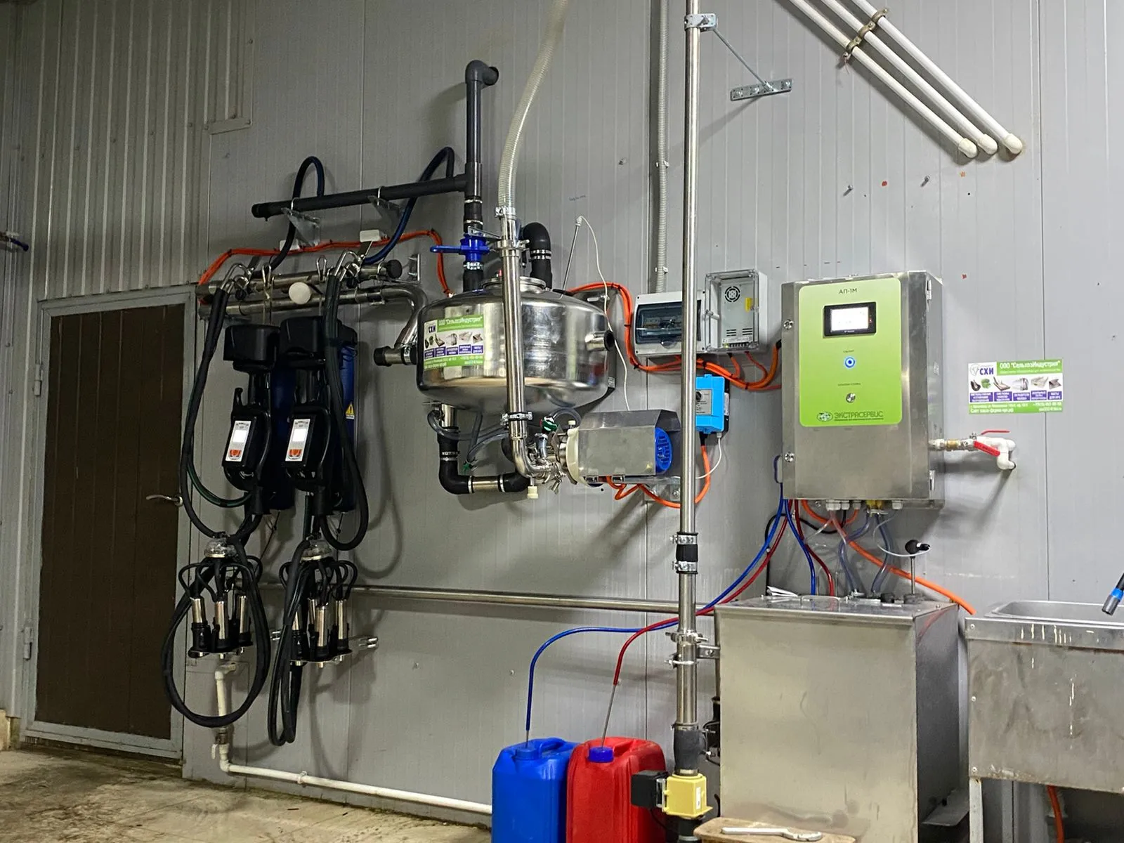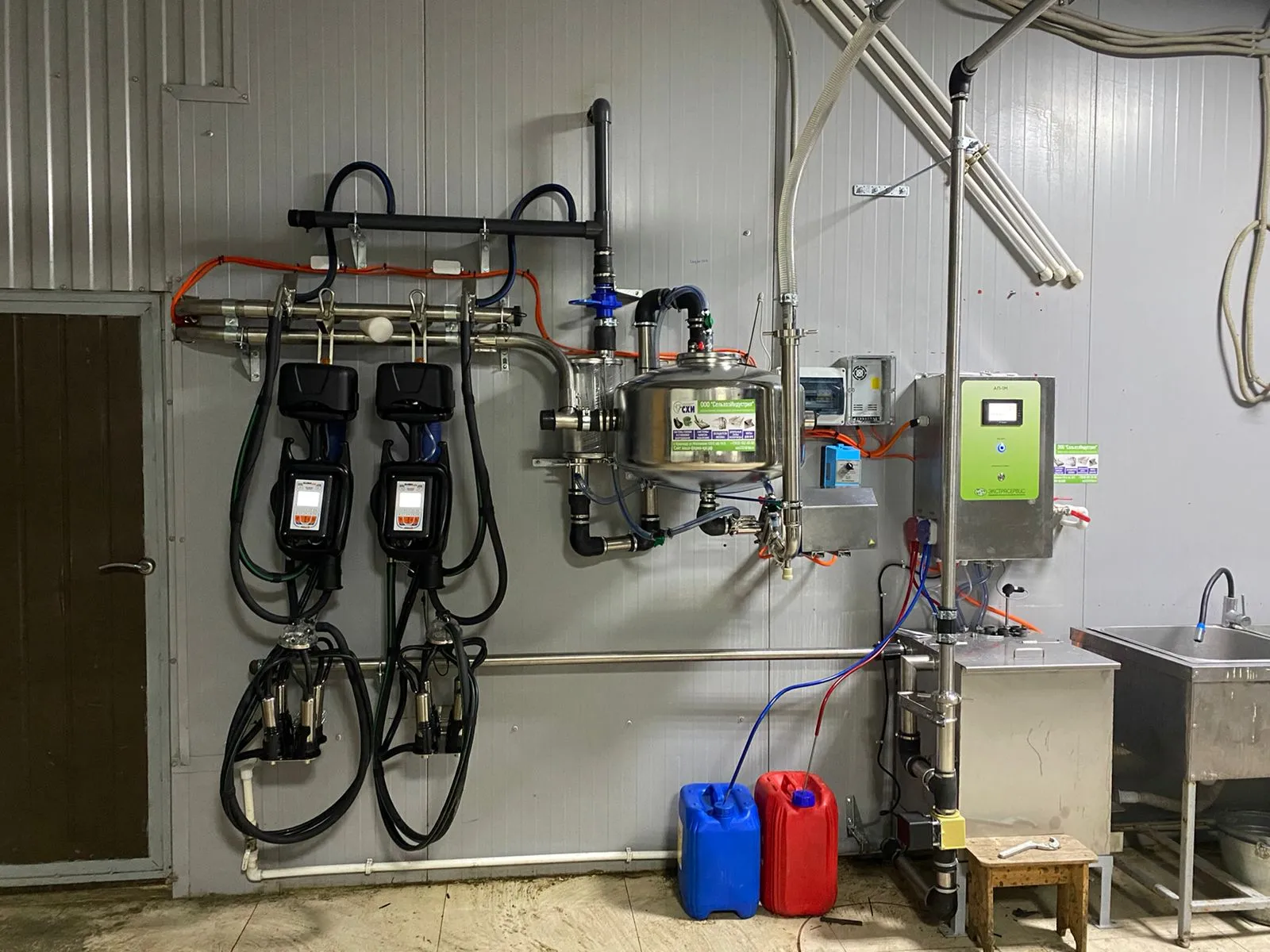 Доильная установка с проходными станками на 4 поста. С двумя переносными доильными аппаратами Jet Tuch Plus, с автоматическим съемом подвесной части, с ручной идентификацией коров и передачей данных по надою, электропроводности и температуре молока в программу управления стадом MPC.